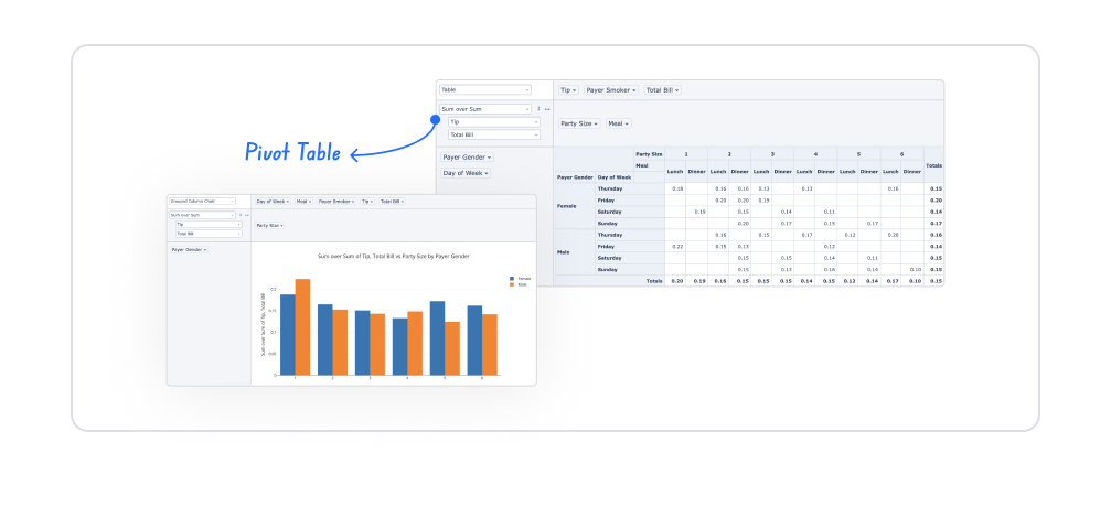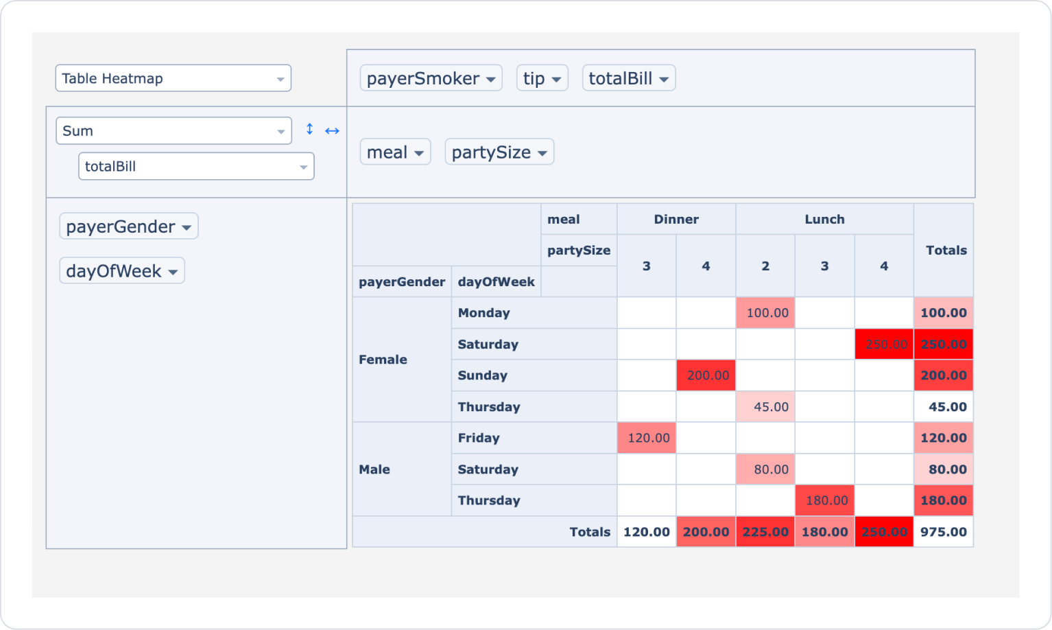 In the second example, when the display type is changed to Table Heatmap, the total bill amounts on the Pivot Table are visualized as a heat map. Cells with higher amounts are highlighted in darker colors, making it easy to identify the days, meals, and table sizes with the highest spending.