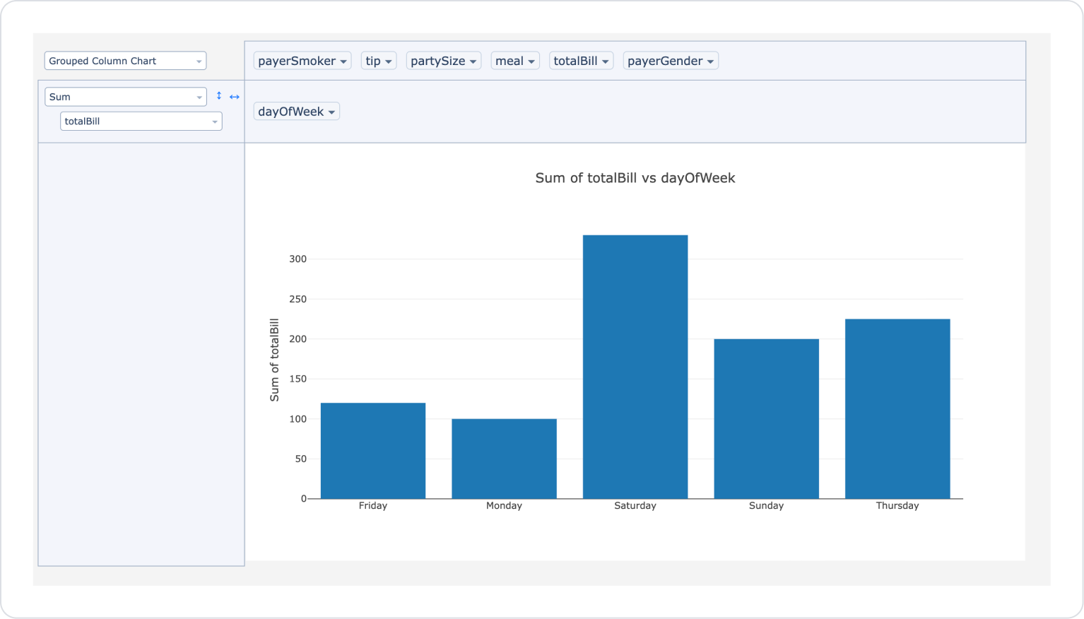 In the last example, when the display type is selected as Grouped Bar Chart and the totalBill field is used in Maximum mode, the highest account amounts for the days worked are grouped by day and listed for comparison. This allows for quick analysis of which days had the highest expenditures.