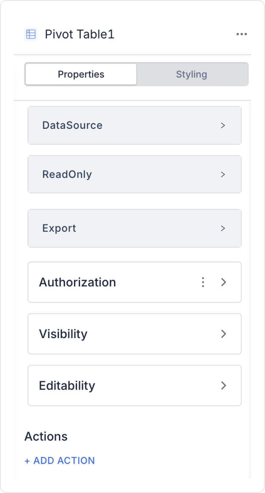 The Pivot Table element supports a special action that is triggered whenever users change the configuration (row/column fields, metrics, filters) on the table. This action is accessed via the ADD ACTION panel.