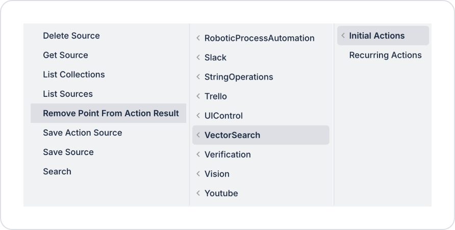 The Remove Point From Action Result action deletes vector records (points) that were previously added as an action result from the Qdrant collection. This action is used when data added with Save Source or Save Action Source needs to be retrieved or cleaned based on a specific correlationId.