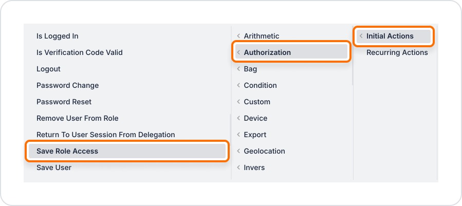 The Save Role Access action is used to save or update the access permissions associated with a role in the Kuika platform. As a fundamental part of authorisation management, this action ensures that system security and access control are managed in a sustainable manner.