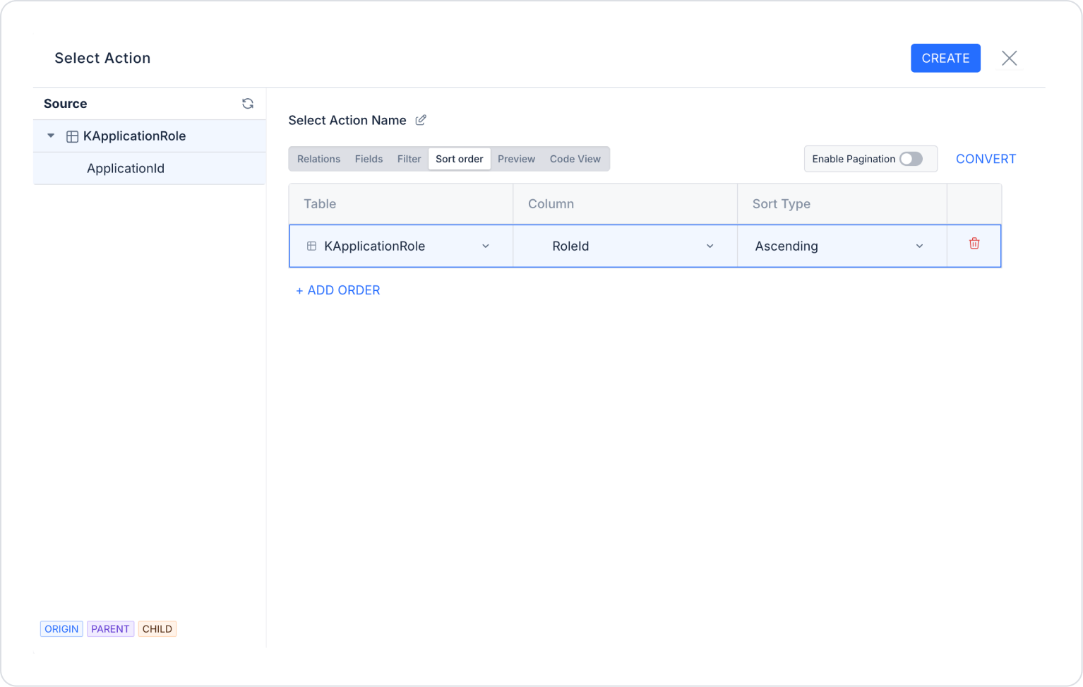 Click the + icon next to the Actions tab under the Sources panel and select the New Select Action option.
