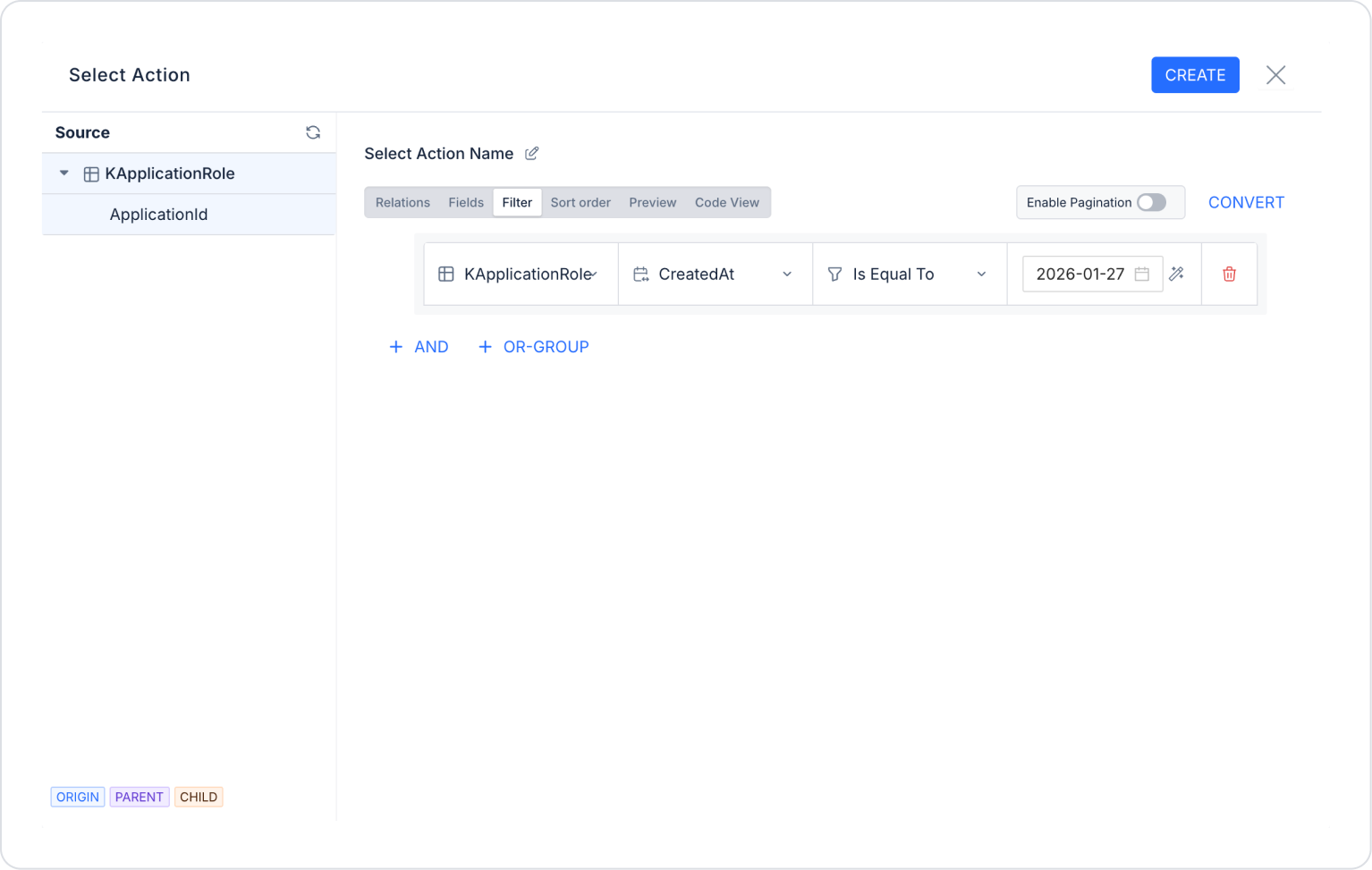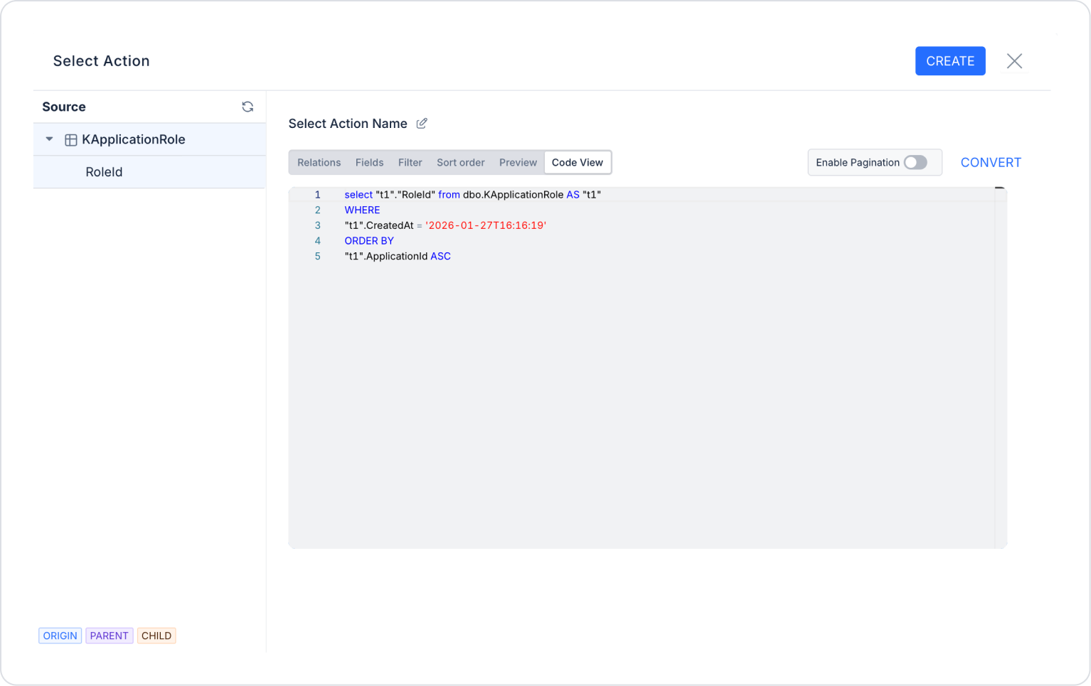 Once you click the Convert to SQL Action option, you cannot return to the Select Action modal. Editing can be done via the SQL Editor.