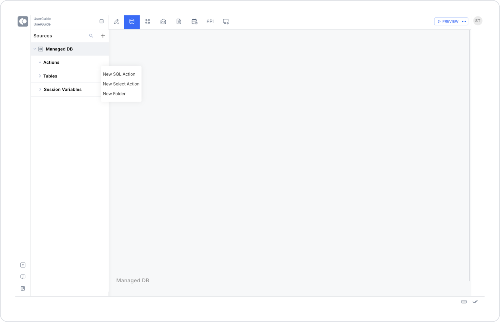 Click on the + icon next to the Managed DB heading and select the Select Action option.