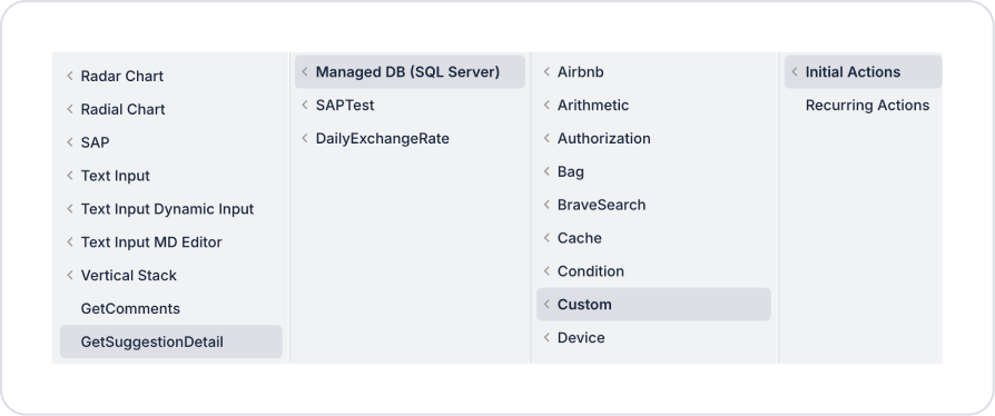 To display sample data in the comments area, add the Add Action > Initial Action > Custom > Managed DB > GetSuggestionDetail action.