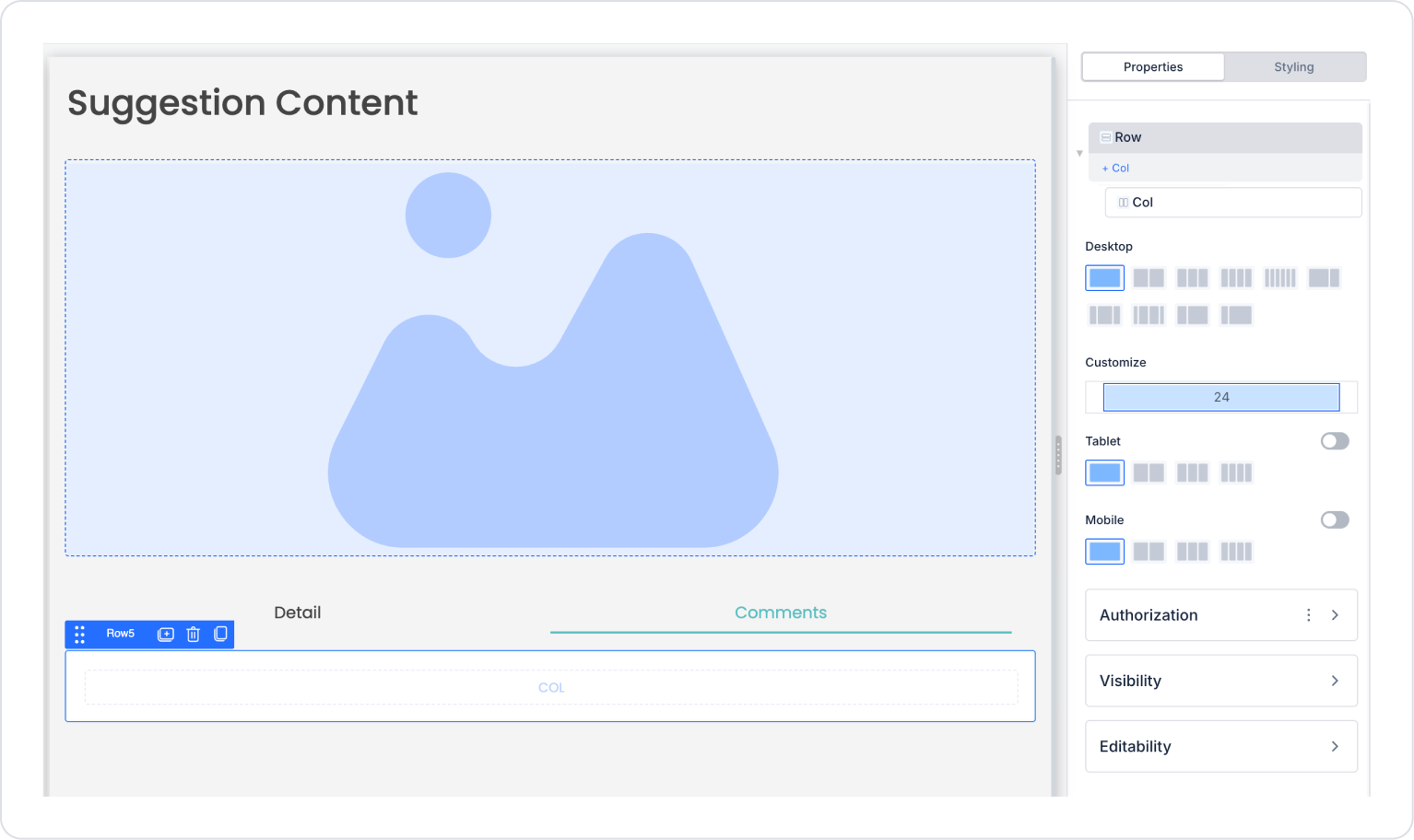 Click on the Comments header and drag the Elements > Container > Row element into it. Set the Column count to one.