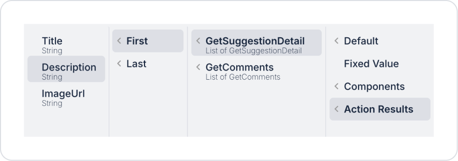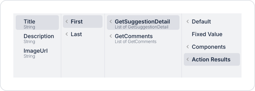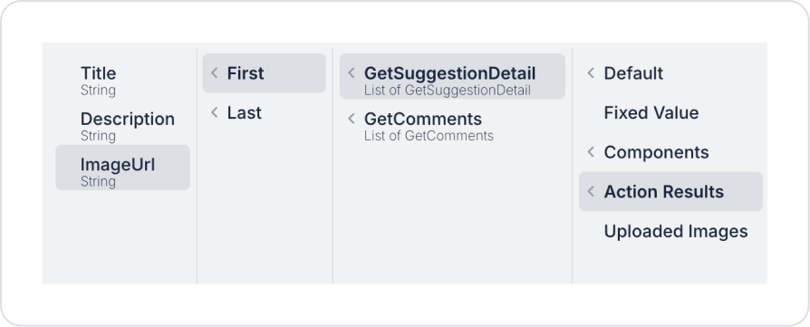 Click on the Image element and define the Image > Properties > Value > Action Result > GetSuggestionDetail > First > ImageUrl field.