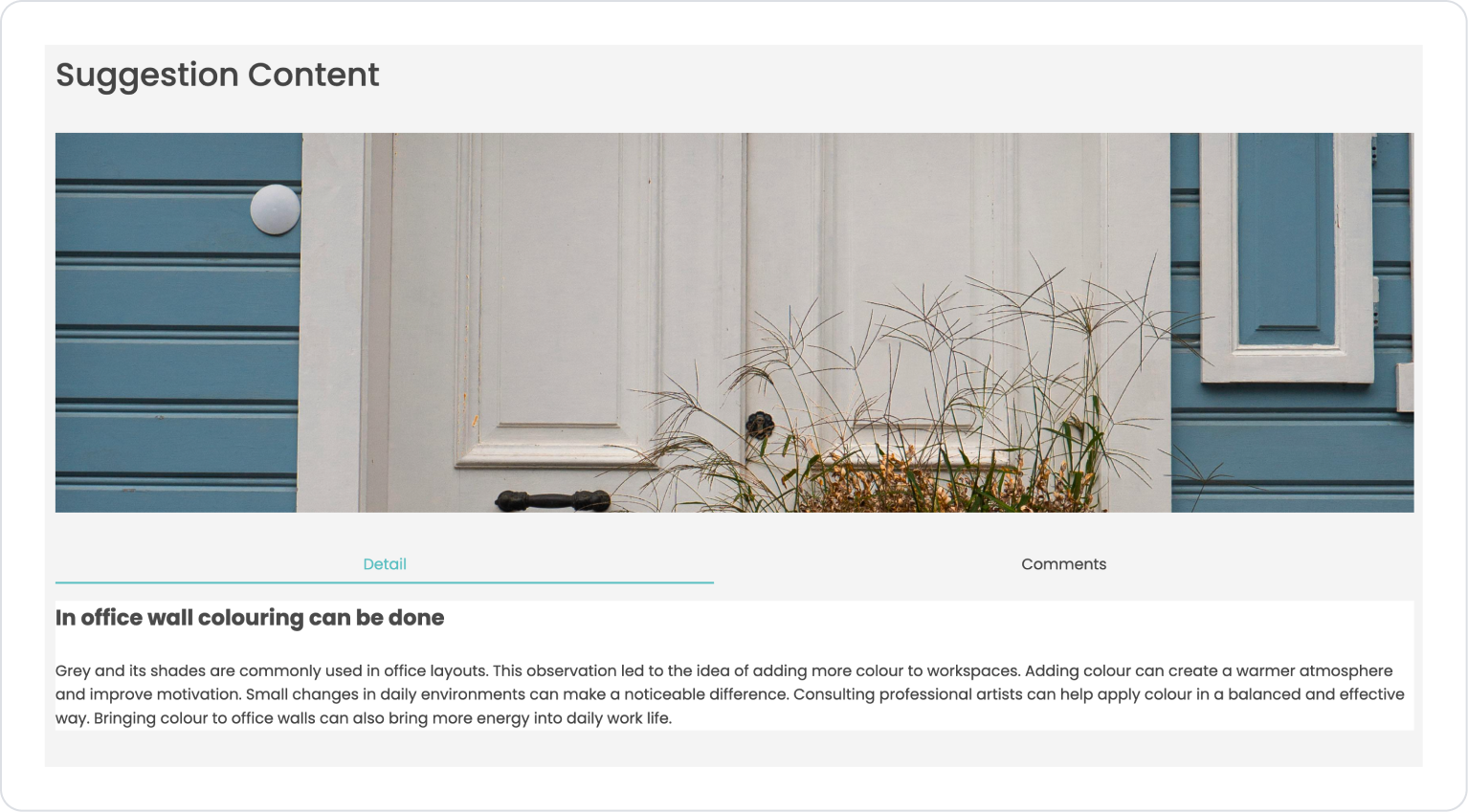 'Grey and its shades are commonly used in office layouts. This observation led to the idea of adding more color to workspaces. Adding color can create a warmer atmosphere and improve motivation. Small changes in daily environments can make a noticeable difference. Consulting professional artists can help apply color in a balanced and effective way. Bringing color to office walls can also bring more energy into daily work life.‘ AS Description,