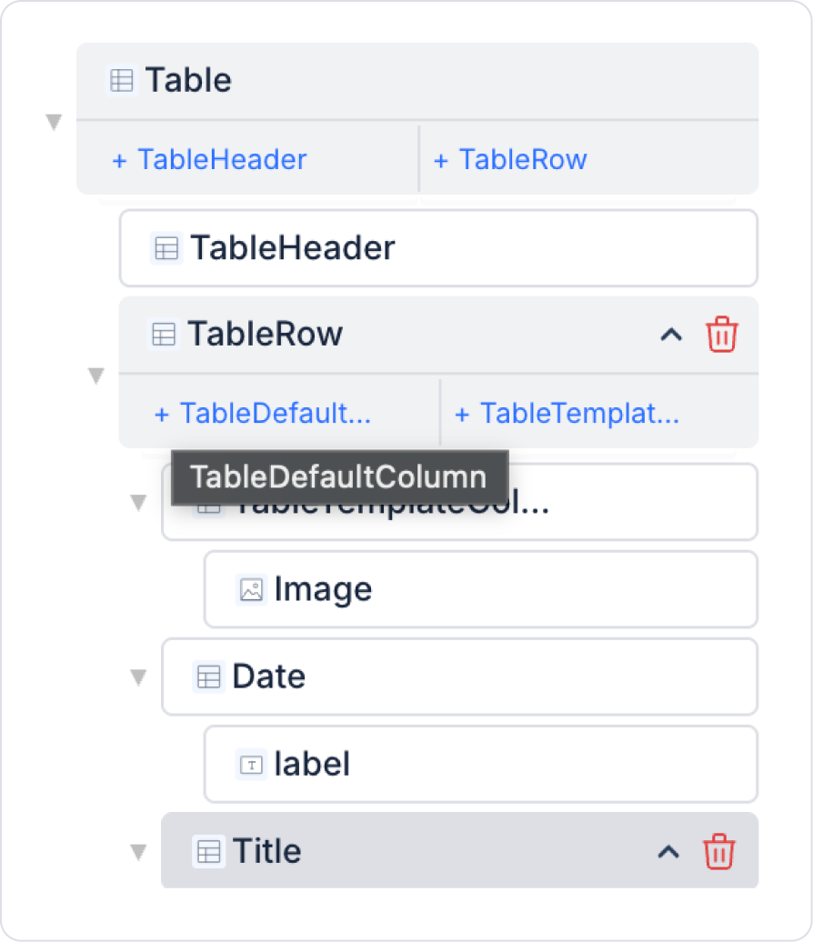 To add new columns, create a new column from the Table > Properties > Table > TableRow > TableDefaultColumn field.