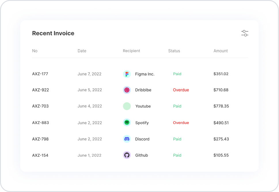 In a finance or subscription application, the Table element is used to allow users to track their latest invoices. The table lists the invoice number (No), invoice date (Date), recipient company or service provider (Recipient), invoice status (Status), and amount information (Amount) in an organized manner.