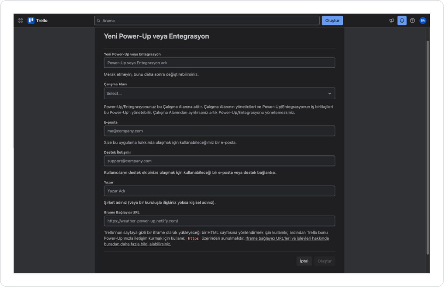 Go to the relevant site and log in. On the page that opens, click the Power-Up Admin Portal link. On the screen that appears, check the checkbox and press the Continue button. Since only the API Key will be retrieved, you can enter “https://example.com/” in the “Iframe connector URL” field. After filling in the required fields, click the Create button. Go to the API Key section in the left menu → Create a new API key → Follow the Create API key steps. The API Key is created here. Click the Token button on the right. Scroll down to the bottom of the screen that opens and click the Allow button. The generated Token will appear on the screen; copy it. This information is added to the Trello MCP Setting field in Configuration Manager.