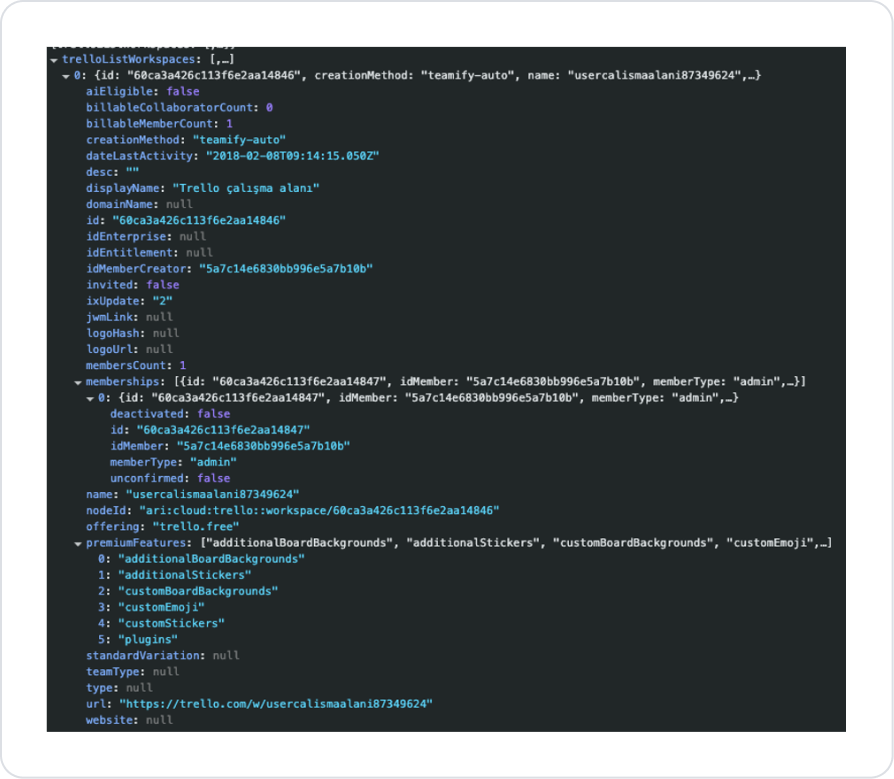 id (String) → Unique workspace ID. creation_method (String) → How was the workspace created? (e.g., “standard”, “invite”). name (String) → Workspace short name (slug). display_name (String) → Name visible to the user. desc (String) → Description. domain_name (String) → Custom domain information (if available). id_enterprise (String) → Enterprise ID (if available). id_entitlement (String) → Entitlement ID. id_member_creator (String) → Member ID of the creator. invited (Integer) → Number of invited users. members_count (Integer) → Number of members. billable_member_count (Integer) → Number of billable members. url (String) → Workspace URL. website (String) → Related website. logo_url (String) → Workspace logo. ai_eligible (Boolean) → Is it eligible for AI features? premium_features (Array) → List of premium features. team_type (String) → Workspace type (e.g., “education”, “standard”). date_last_activity (DateTime) → Last activity time. memberships (Array) → Membership information. id, id_member, member_type, unconfirmed, deactivated 2. Trello List Boards in Workspace
