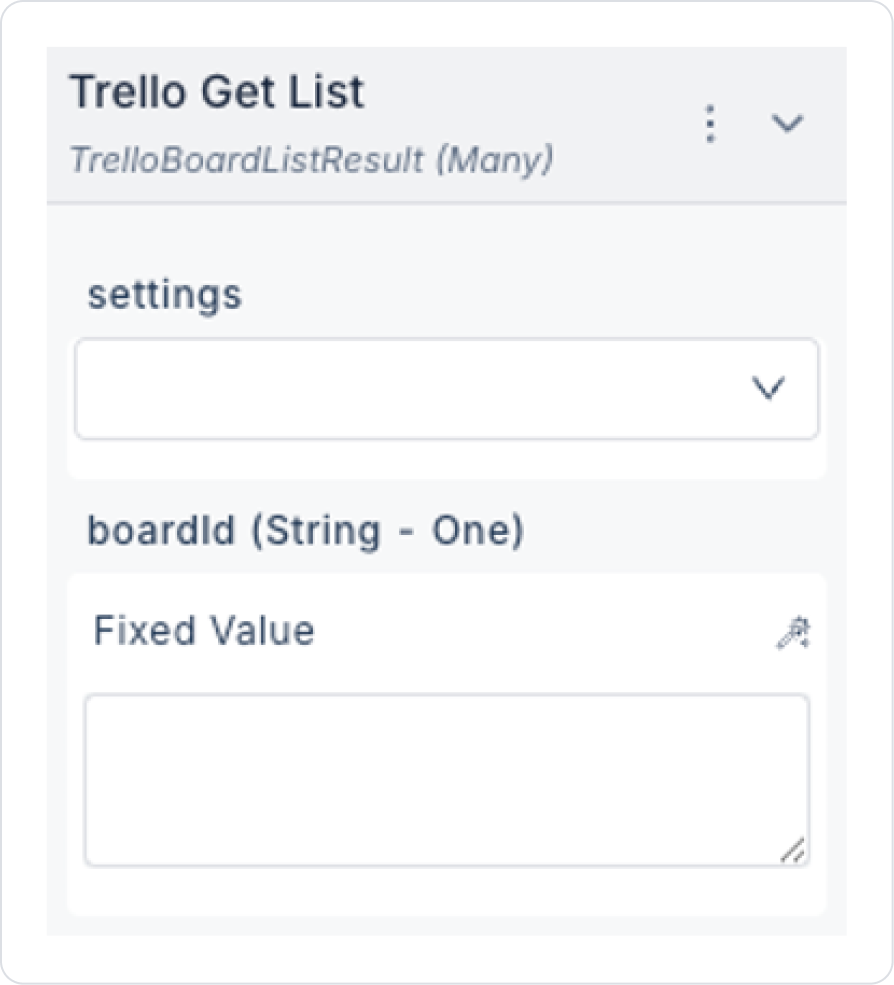 settings → Trello setting workspaceId → Workspace ID (found with List Workspaces) Output