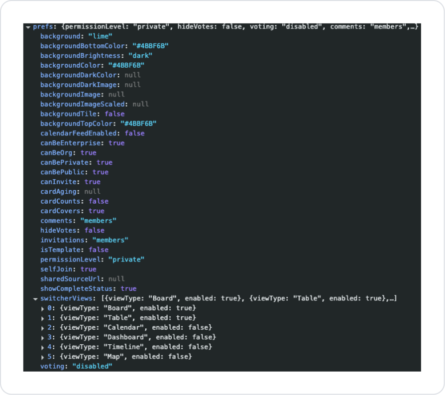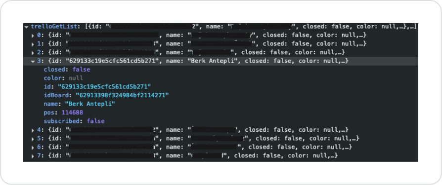 id (String) → List ID. name (String) → List name. closed (Boolean) → Is it archived? color (String) → List color. id_board (String) → Associated board ID. pos (Integer) → Position. subscribed (Boolean) → Is the user subscribed? 4. Trello List Boards