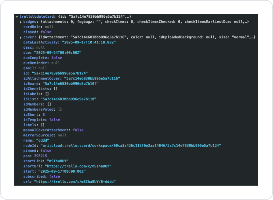 id (String) → Card ID. name (String) → Card name. description (String) → Description. closed (Boolean) → Is it archived? date_last_activity (DateTime) → Last activity. due (DateTime) → Due date. start (DateTime) → Start date. id_board (String) → Board ID. id_list (String) → List ID. id_members (Array) → Card members. labels (Array) → Labels. cover (Object) → Card cover information. badges (Object) → Card badges: attachments, check_items, comments, votes, due_complete short_url (String) → Card short link. url (String) → Card URL. subscribed (Boolean) → Is the user subscribed? 6. Trello Add Card To List