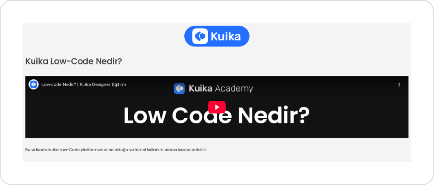 A short informational text about the training content is displayed in the description field below the Video Player. This area provides the user with a brief explanation of what the Kuika Low-Code platform is and its basic purpose.