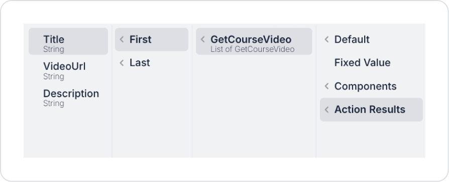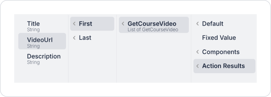 Set the video URL to be played as VideoPlayer > Properties > Url > Action Results > GetCourseVideo > First > VideoUrl.
