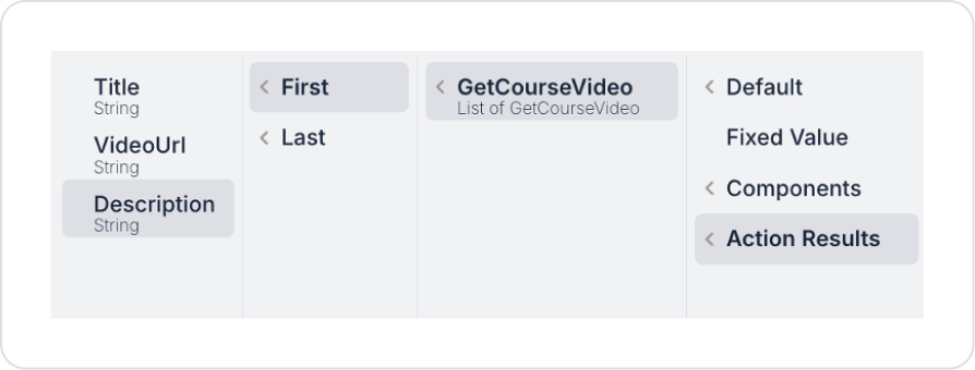 Define the Label > Properties > Value > Action Results > GetCourseVideo > First > Description field to display the video description.