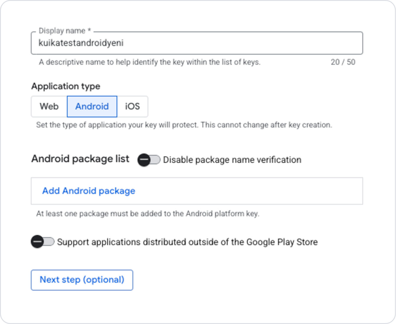 After selecting Android, enter the Bundle ID information found in the Configuration Manager → Android tab of the project you created on the Kuika platform in the field that opens.