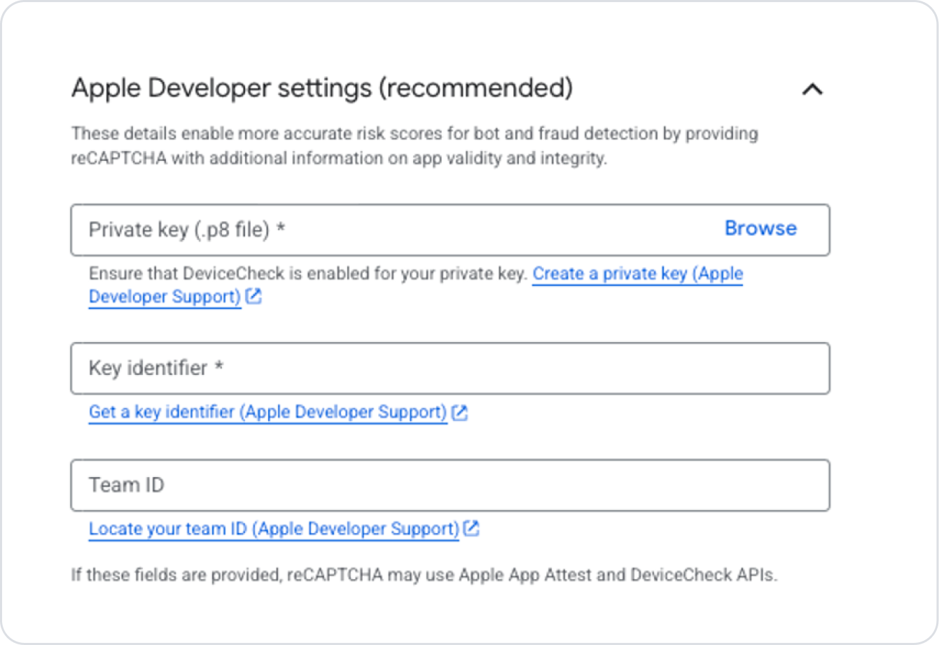 After saving the Bundle ID, you need to configure the Apple Developer Settings field at the bottom of the page. This information will be retrieved from your Apple Developer account.