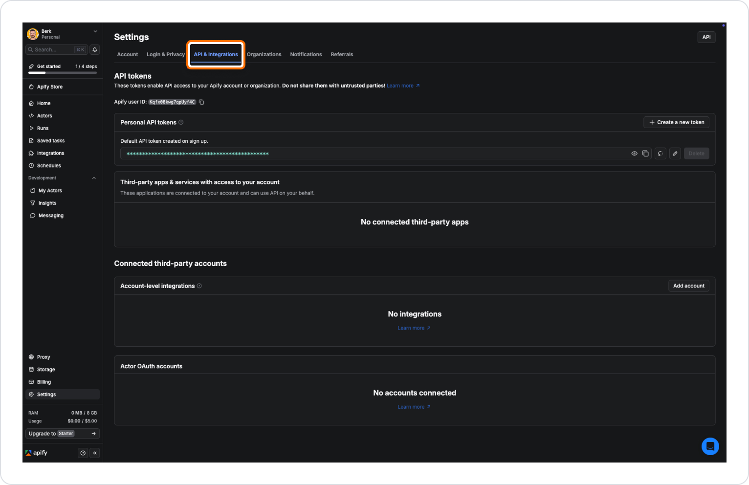 - Üst sekmelerden API & Integrations bölümüne geçin.