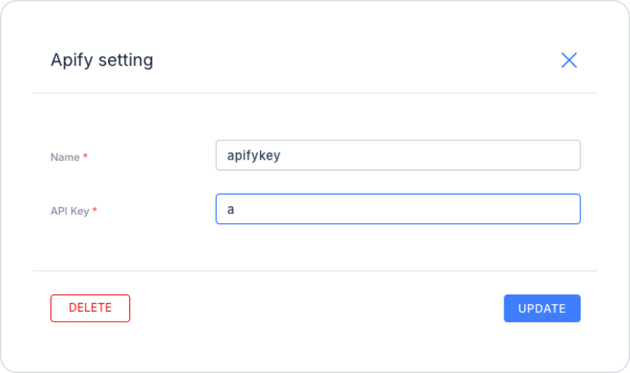 API Key alanına yapıştırın. - Kaydettikten sonra bu ayar, projedeki Apify Action içinde settings parametresine bağlanarak kullanılabilir.