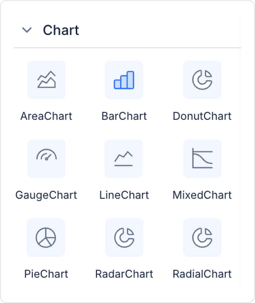 Bar Chart elementi, kategorik verileri karşılaştırmanın etkili ve anlaşılır bir yolunu sunar. Her bir kategoriyi temsil eden çubuklar sayesinde kullanıcılar, farklı gruplar arasındaki miktar veya toplam farklarını kolayca karşılaştırabilir. Satış analizleri, anket sonuçlarının değerlendirilmesi, performans karşılaştırmaları ve tüm kategorik veri görselleştirme senaryolarında sıkça tercih edilir.