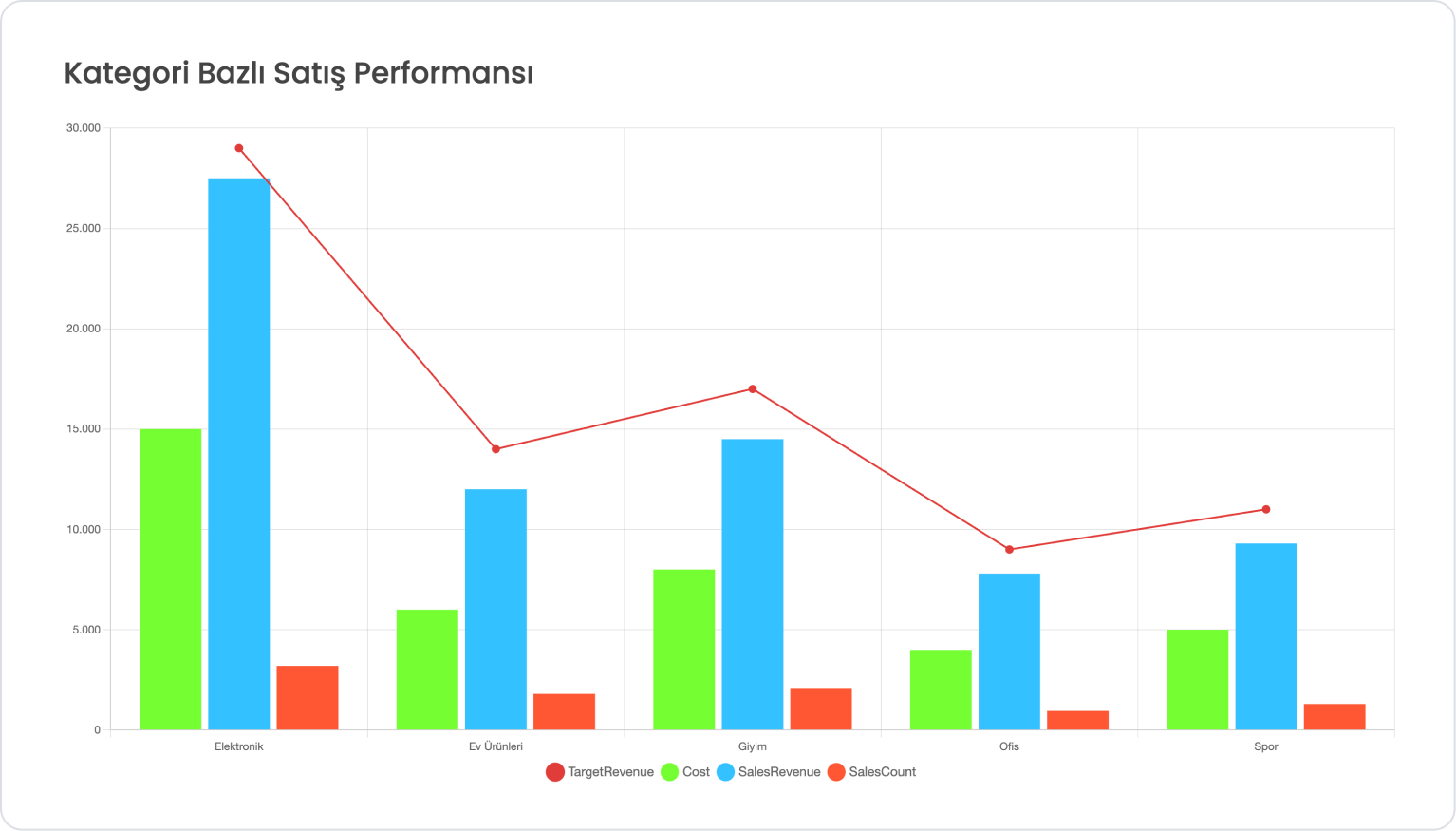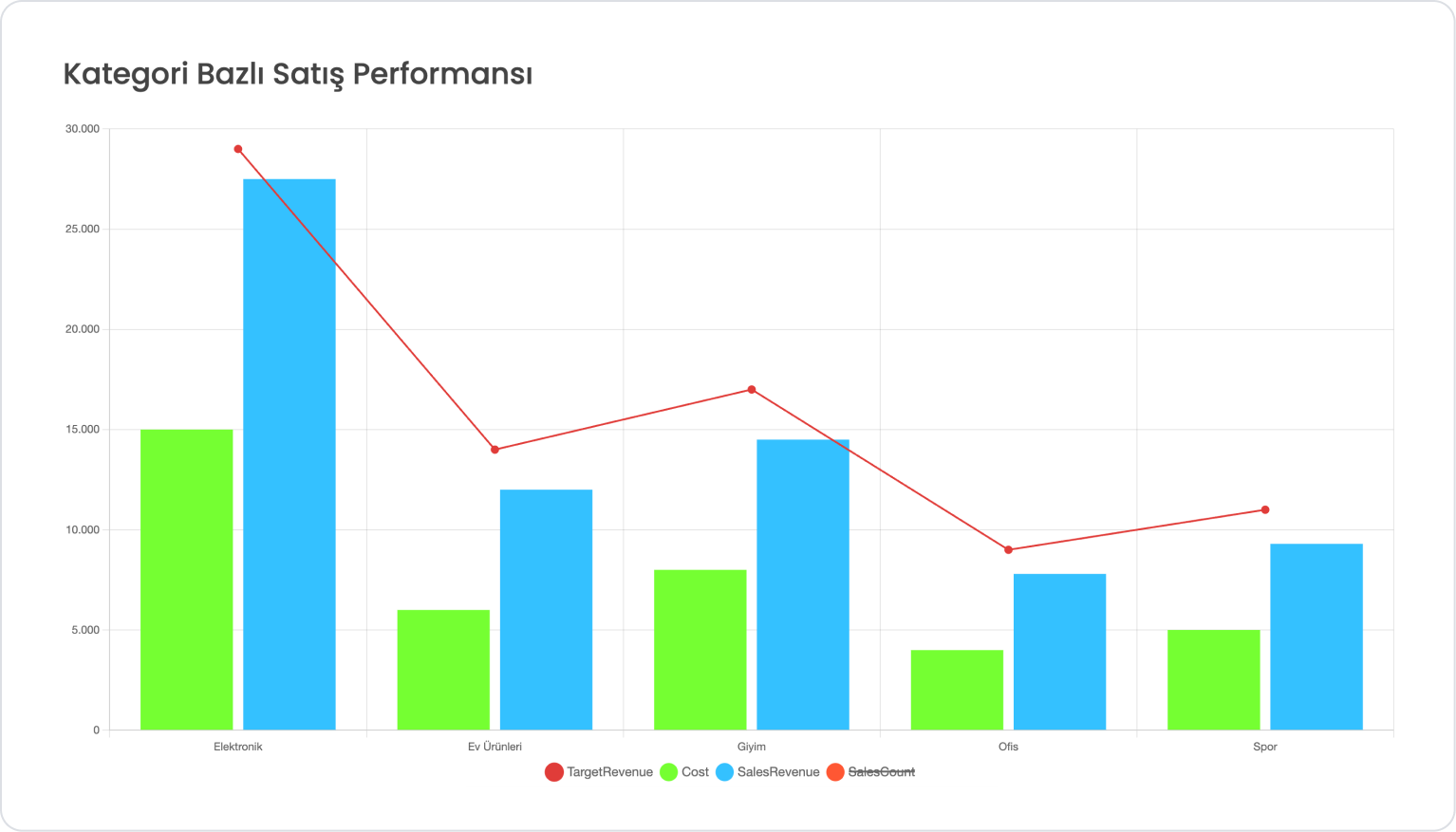 Bu veriler Bar Chart üzerinde birden fazla seri olarak görüntülenir ve kullanıcı kategoriler arasındaki satış performansını kolayca karşılaştırabilir.