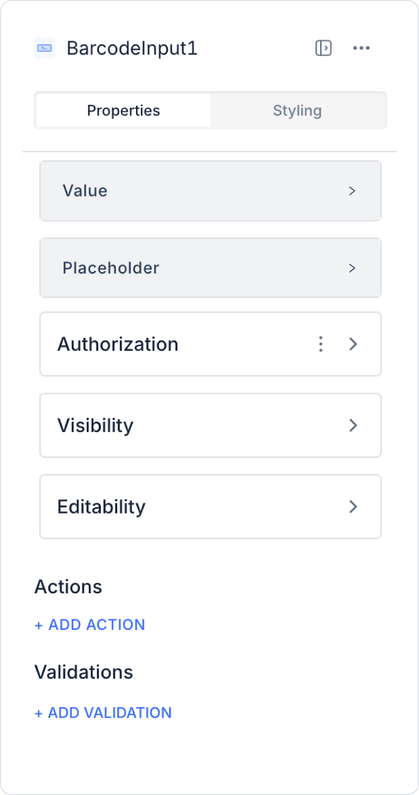 Barcode Input elementi, kullanıcı barkod okuttuğunda veya manuel giriş yaptığında tetiklenebilen olaylar (event’ler) üzerinden aksiyon eklenmesine olanak tanır. Element seçildiğinde ADD ACTION alanında aşağıdaki tetikleyiciler kullanılabilir: