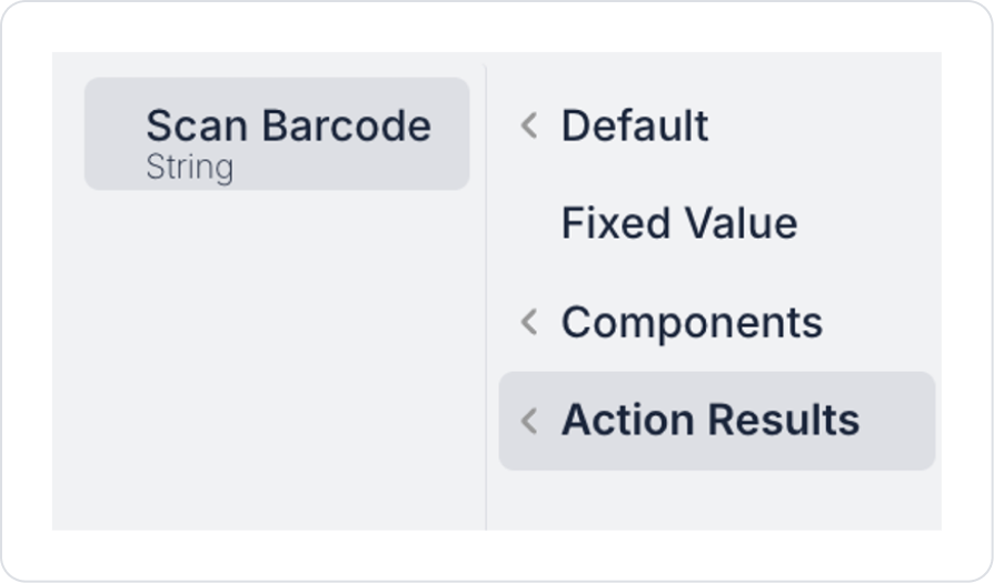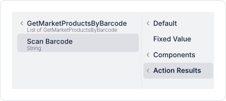 Barcode Input elementine tıklayın ve BarcodeInput > Properties > Value > Action Results > Scan Barcode aksiyonunu bağlayın.