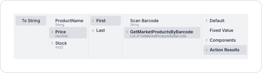 Fiyatlandırma için fiyat Label elementinde Label > Properties > Value > Action Results > GetMarketProductsByBarcode > First > Price > To String tanımlamasını yapın.