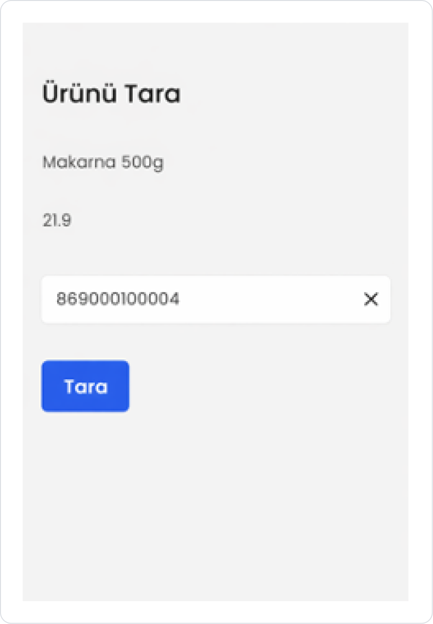 Okutulan barkoda karşılık gelen ürünün isim ve fiyat bilgileri sistem tarafından getirilerek ekranda görüntülenir. Aynı zamanda, okutulan barkod numarası Barcode Input alanı üzerinde takip edilebilir şekilde gösterilir.