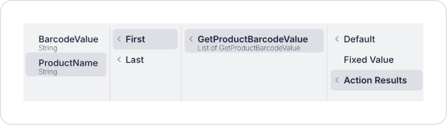 Barcode alanı içerisine yazılacak değeri BarcodeRenderer > Properties > Value > Action Result > GetProductBarcodeValue > First > BarcodeValue tanımlayın.