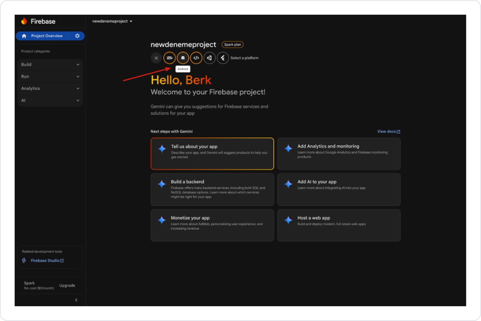 Proje oluşturulduktan sonra Add app > Android seçeneğini seçin.