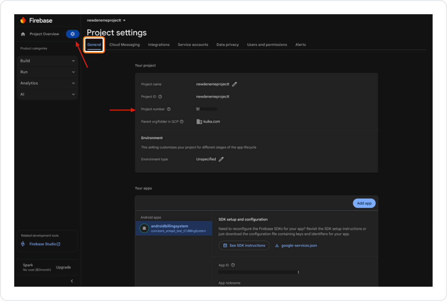 Açılan sayfadaki “General” sekmesinden “Your Apps” başlığı altında seçilen uygulamanın google-service.json dosyasını indirme bağlantısı bulunur.