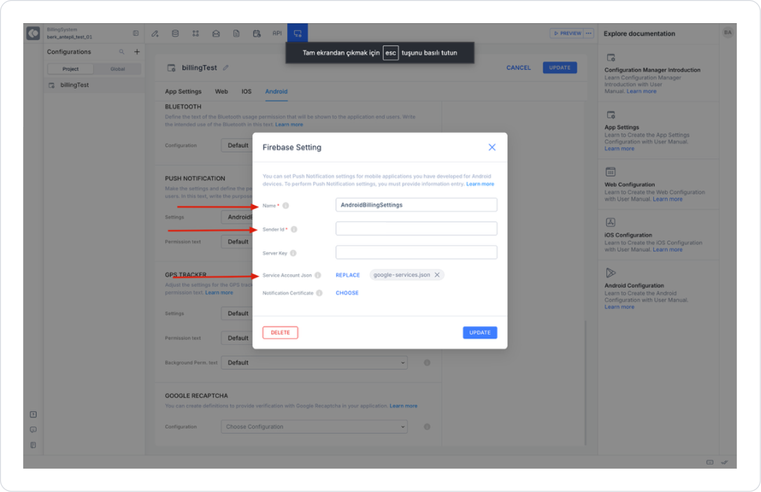 Configuration Manager’da google-service.json dosyası gerektiğinden dolayı öncelikle Firebase üzerinden (http://console.firebase.google.com/) ilgili dosya indirilir ardından Android sekmesi altında kurulum yapılır. Google Play Console üzerinden de ücretlendirme için alan açılır.