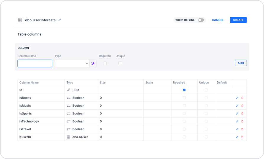 Son olarak yeni kayıt için Id alanına Default > New Guid tanımlamasını yapın.