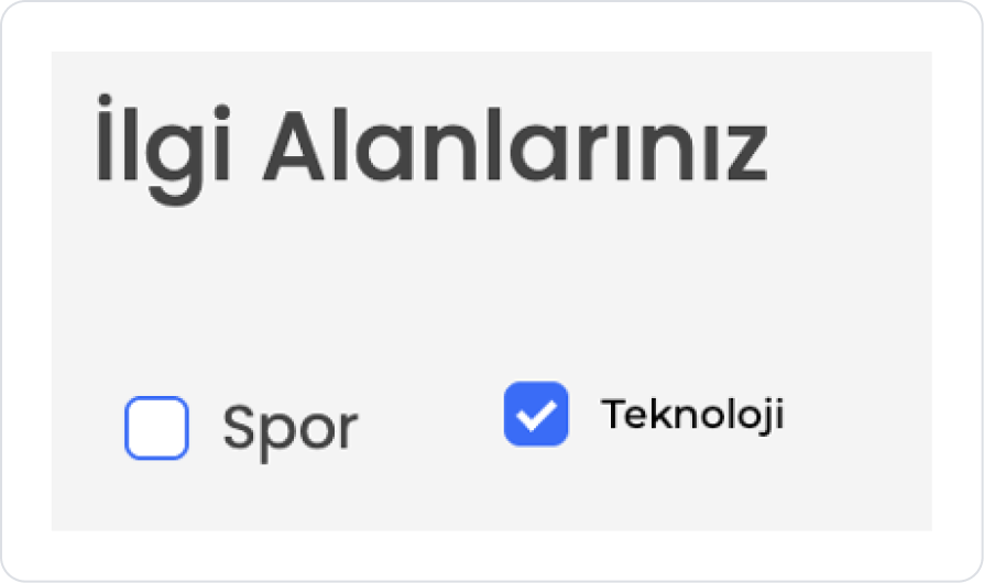 Kullanıcı, profil oluşturma veya tercih ayarları ekranında ilgi alanlarını belirlemek için Checkbox elementini kullanabilir. Her bir ilgi alanı ayrı bir Checkbox olarak gösterilir ve kullanıcı birden fazla seçeneği aynı anda işaretleyebilir.
