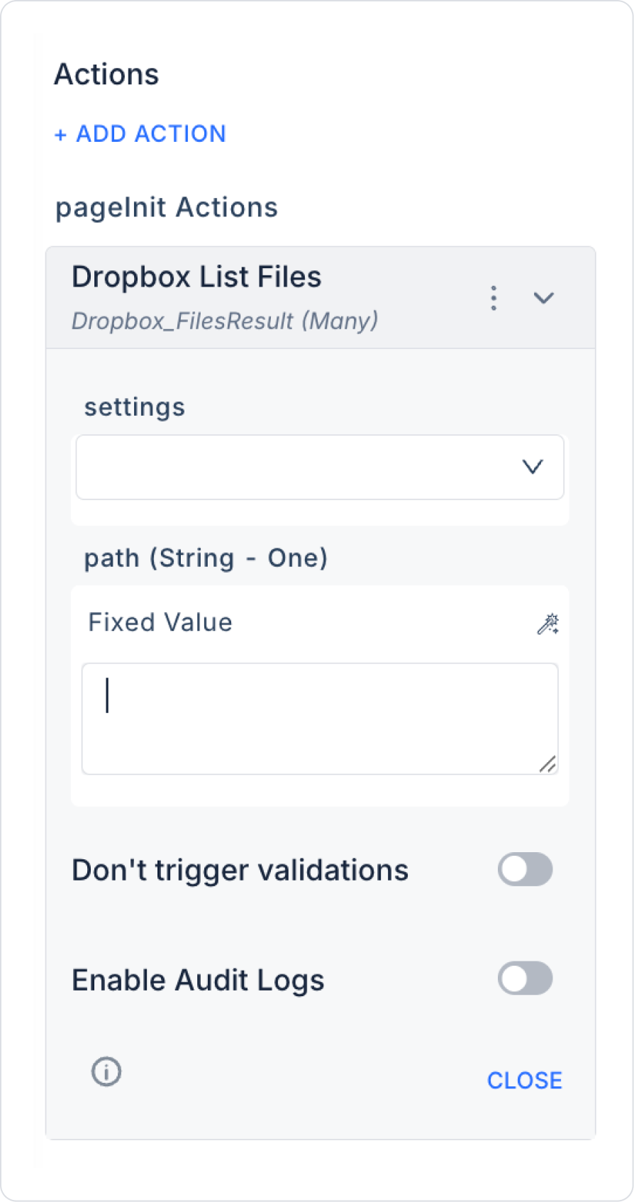 Butona tıklayın ve + ADD ACTION → Dropbox → Dropbox List Files aksiyonunu seçin.
