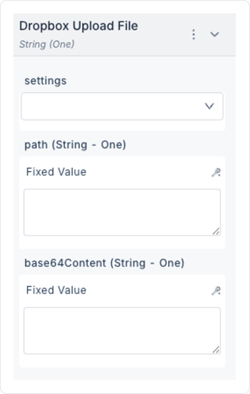 Input: settings path: Yüklenecek dosyanın yolu. base64Content: Dosya içeriği (Base64) Output: 5. Dropbox Move Item