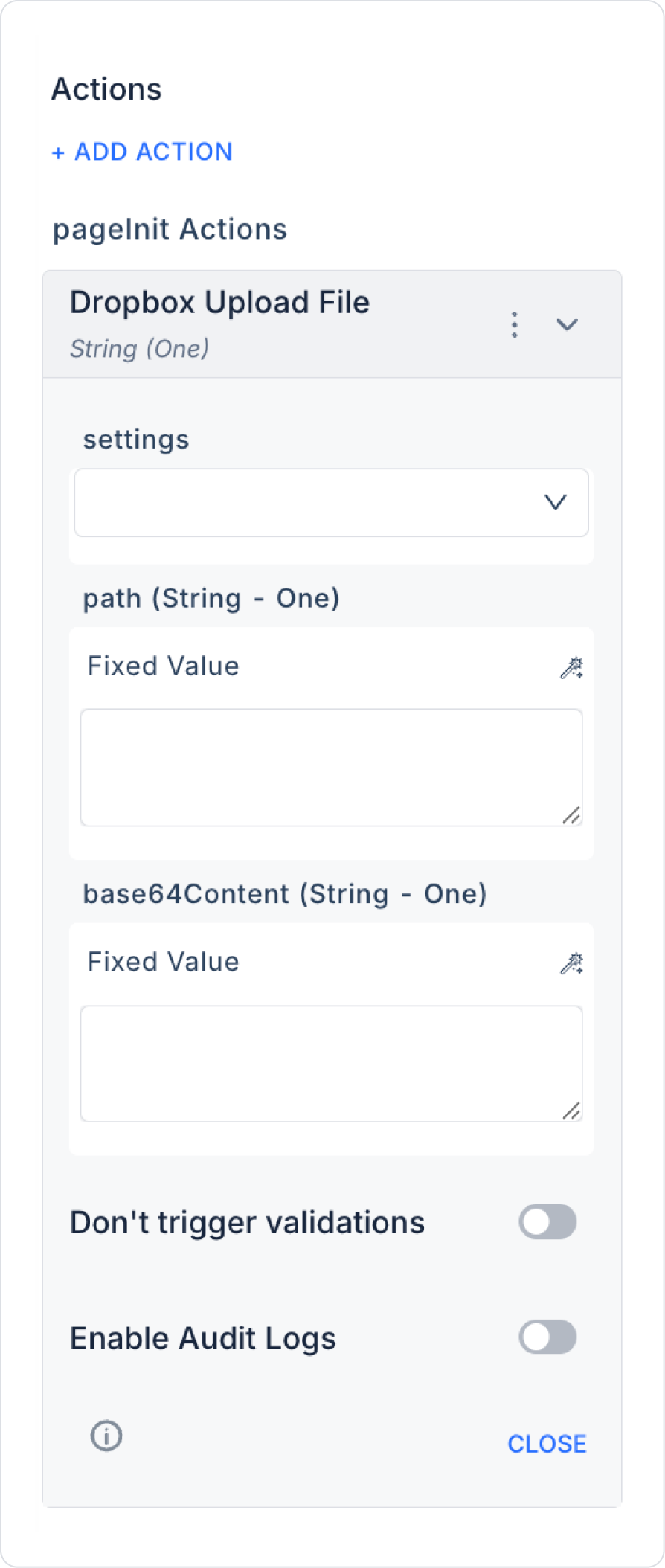 Dosya Yükleme İşlemi (Upload Paneli): Bu aksiyon, base64Content parametresiyle alınan dosya içeriğini Dropbox’a yükler ve path parametresi ile belirtilen konuma kaydeder.