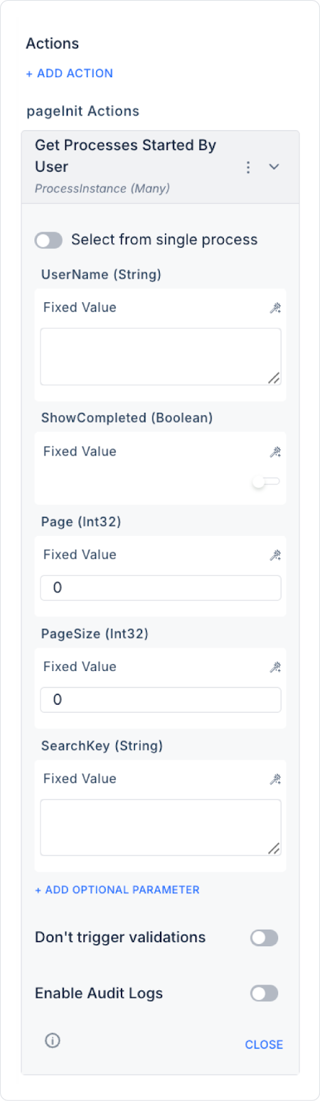 + ADD ACTION menüsünden istediğiniz tetikleyici olaya (Initial Actions, OnClick, OnBlur vb.) göre Process Automation > Get Processes Started By User aksiyonunu ekleyin.