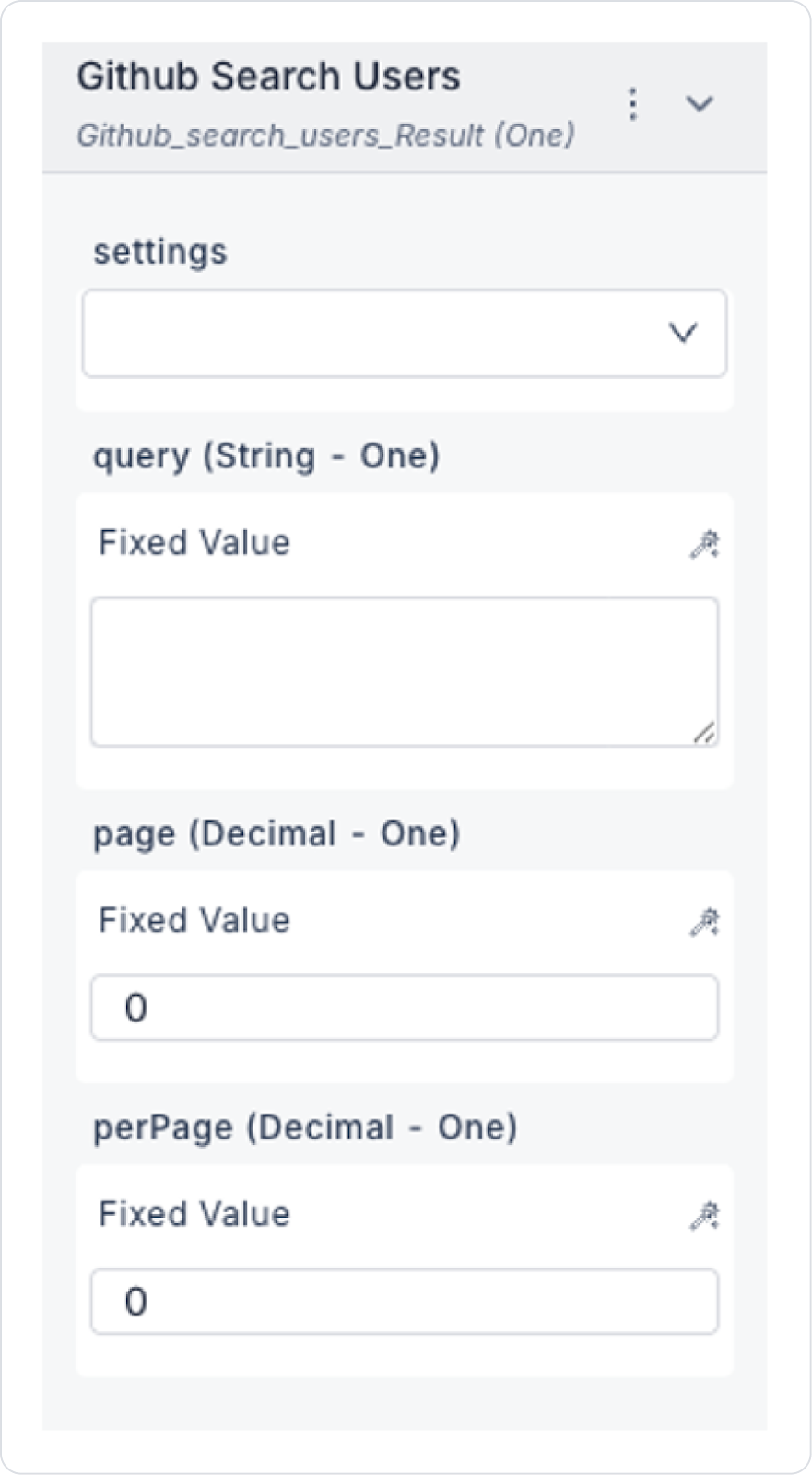 settings: GitHub ayarı. query: Arama ifadesi (örn: "john smith", "location:seattle", "followers:>100"). page: Hangi sayfayı getireceği. perPage: Sayfa başına sonuç sayısı. Action Output
