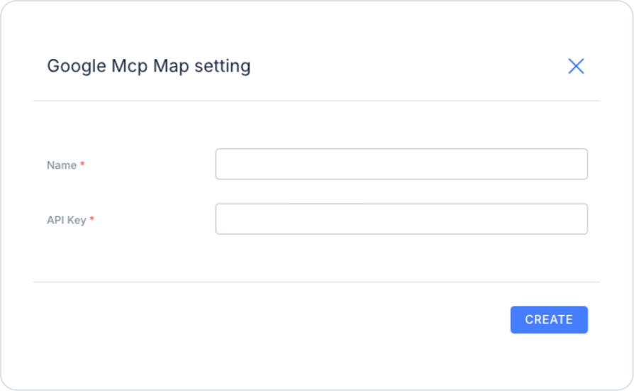 Kuika platformuna giriş yapın. Çalışacağınız projeyi seçin. Configuration Manager → App Settings sekmesine gidin.MCP → Google Map altında ADD NEW seçeneğini tıklayın.Açılan pencerede: Name : Ayar için isimlendirme.API Key : Google Cloud Console’dan aldığınız key. Google Map API Key Oluşturma