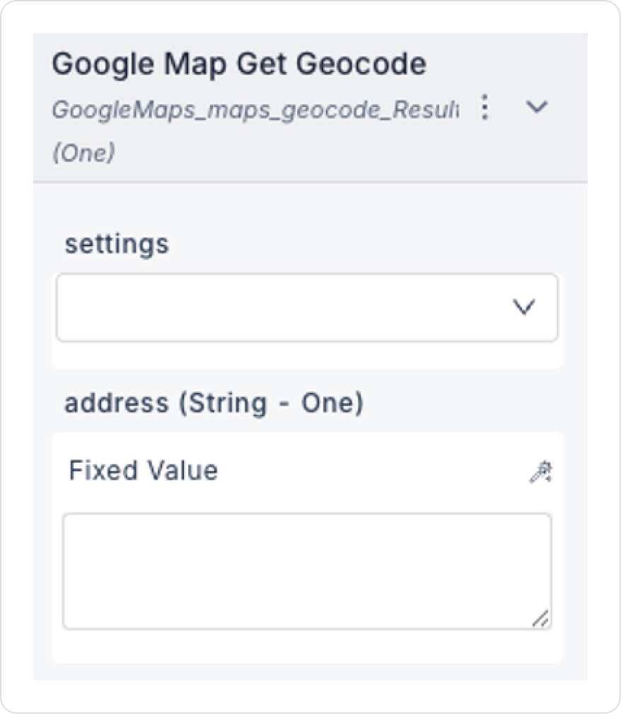 settings: Config Manager’da oluşturulan Google Map ayarı seçilir.address (String): Kullanıcı tarafından girilen okunabilir adres. (Örn: "İstiklal Caddesi, Beyoğlu, İstanbul")Output: