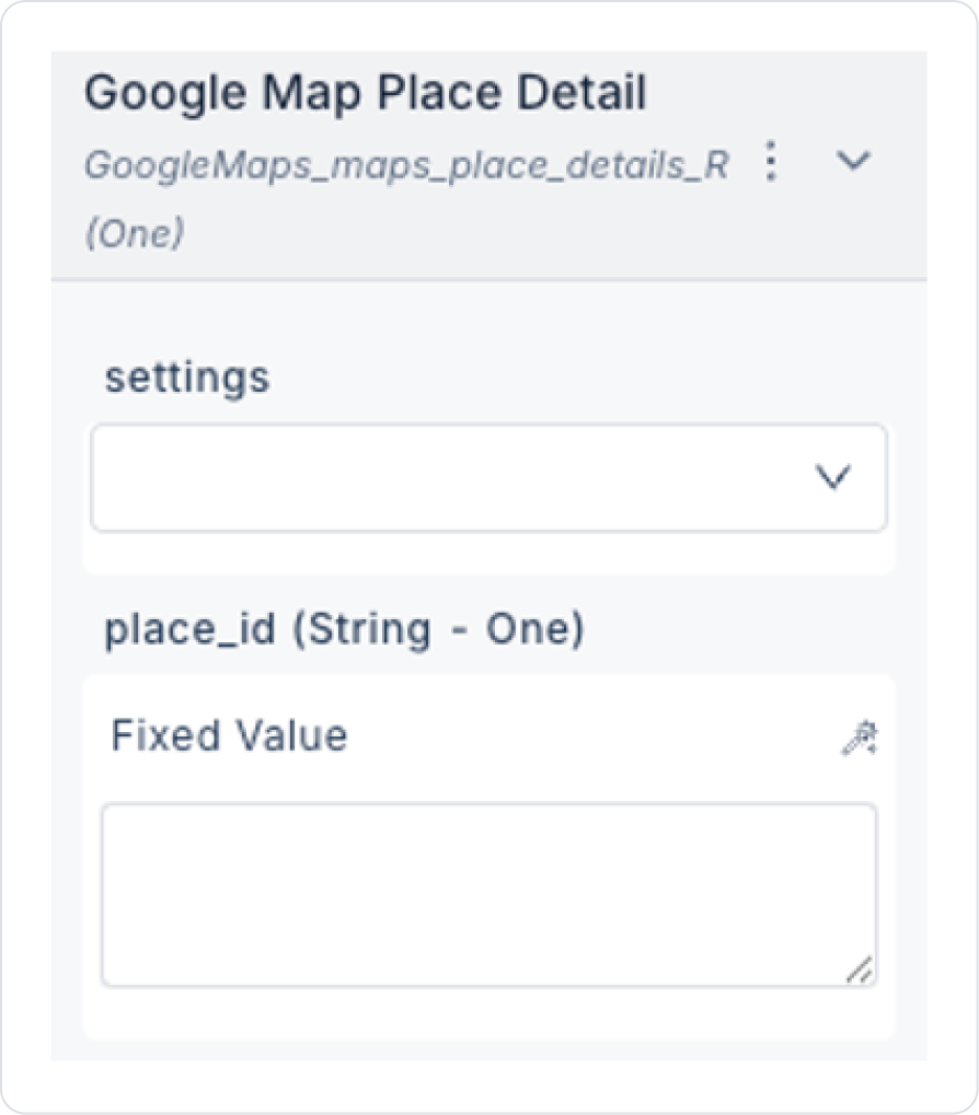 settings: Configuration Manager’da oluşturulan Google Map ayarı seçilir.place_id (String): Mekanın benzersiz kimliği. (Get Geocode veya Search Places sonucunda elde edilir.)Output:
