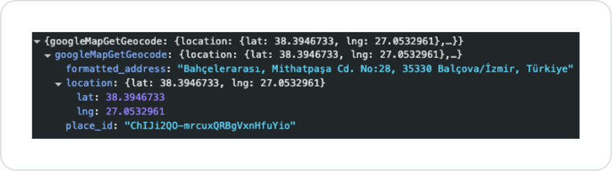 name: Mekan/işletme adı.location.lat, location.lng: Enlem-boylam koordinatları.formatted_address: Standartlaştırılmış adres.Google Map Reverse Geocode