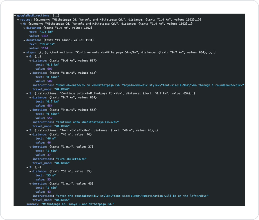 summary: Rotanın genel açıklaması.distance.text / distance.value: Toplam mesafe (örn: "14.3 km", 14300).duration.text / duration.value: Tahmini süre (örn: "20 mins", 1200).steps: Her adım için detaylı bilgi. instructions: HTML formatlı yön tarifi.travel_mode: Kullanılan ulaşım modu.Google Map Distance Matrix