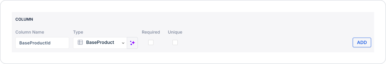 Price ve DiscountedPrice sütunları eklenirken Decimal veri türünde Decimal Scale > 2 olarak ayarlayın. BaseProductId type alanına BaseProduct tablo adını yazınız.