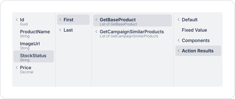 Image elementine tıklayın. Image elementinde Image > Properties > Value > Action Results > GetBaseProduct > First > ImageUrl olarak ayarlayın.